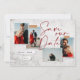Modern minimal photo wedding save the date. On trend flat lay design with realistic looking pins ripped paper and washi tape on a textured rustic wood effect backer with hand written text.