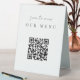 Make it easy for your wedding or event guests to view your menu selections with this QR code table tent sign. "Scan to view our menu" appears at the top. Enter the url for your menu, and the QR code will update. Guests can scan the code with their phones to see your menu selections.
