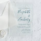This simple modern wedding invitation features teal blue text on your choice of a clear or frosted background. Add the names of the bride and groom in stylish handwriting calligraphy and the details in sans serif font.