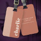 Modern, minimal luggage tag with your custom name aligned vertically to the right on a terracotta brown background.