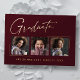Clean, trendy, modern and elegant "3 Photo" graduation announcement gold foil cards (your choice of gold silver or rose foil), featuring design elements of modern text with a unique calligraphy ink script. The graduate's photos are accented with a delicate & minimalist partial boarder. The back of the card offers personalized text spaces for information about your graduation or can be cleared if you wish to hand write a message. Burgundy red with gold foil or easily customize the background to match your school's primary color or any color of your choice. Perfect for the high school, college and university grad student senior.