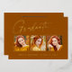 Clean, trendy, modern and elegant "3 Photo" graduation announcement gold foil cards (your choice of gold silver or rose foil), featuring design elements of modern text with a unique calligraphy ink script. The graduate's photos are accented with a delicate & minimalist partial boarder. The back of the card offers personalized text spaces for information about your graduation or can be cleared if you wish to hand write a message. Burnt orange, rust colors with gold foil or easily customize the background to match your school's primary color or any color of your choice. Perfect for the high school, college and university grad student senior.