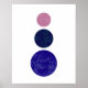 A modern, minimalist abstract art poster of three circles on a white background. The larger circle at the bottom is blue with a faded effect, the circle above is slightly smaller in a darker blue with a similar faded pattern and the very last circle is smaller still in a pretty pink. A lovely addition to any home.