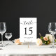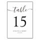 This table number card features sleek black script on a crisp white background, offering a modern minimalist design. Perfect for adding a touch of elegance to your wedding reception, this card is easily customizable. Matching items available.