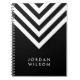 Modern minimalist black notebook featuring a white chevron pattern that you can personalize with your name. Great for school or office.