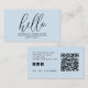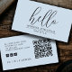 This business card features a simple minimalist script type hello in black typography on a white background. Add your contact information, social media info, and QR code. A simple business card that serves as a friendly introduction.