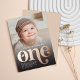A modern and minimalist first birthday photo featuring a boho and bohemian retro style foil typography of "One" in the bottom center and a cute photo of your baby. Personalize the details and picture. The color of the background is a boho brown color.