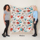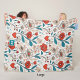 This blanket features a vibrant floral design with a whimsical and modern touch. It showcases an array of red and beige flowers with bold teal leaves and stems, scattered with delicate heart motifs and subtle splashes of abstract detailing. The background is a soft white, allowing the colorful elements to pop. A customizable monogram block is included near the bottom, where initials (currently “MW”) can be replaced with your choice of letters to personalize the piece. The overall aesthetic is cheerful, contemporary, and perfect for adding a touch of warmth and charm to any space.