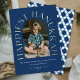 This stylish and minimalist holiday card design features an arc photo template and big classic serif foil pressed greeting in the words, 'HAPPIEST HANUKKAH' wrapping around the edge of the arch frame on a dark blue background. Additional wishes and the family name are located near the bottom. The back of the card is filled with a modern and abstract geometric 'star of david' pattern in the same matching navy blue color.