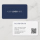 Create your own professional business card with this simple and stylish design. A double-sided template personalized with your logo, name, address, contact information, and a scannable QR code. All the text can be customized or deleted, so you can include the information you want. Printed colors: deep navy blue, black and white. Choose from a range of paper textures and weights.