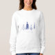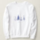 The Modern Minimalist Merry Christmas Tree Sweatshirt is a stylish and cozy holiday apparel item. It features a simple yet elegant design with four stylized Christmas trees in shades of blue and white, arranged in ascending order of height. The trees have varying patterns, including solid, striped, and dotted, and are complemented by small dots representing snowflakes or stars.