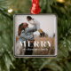 Elegance meets simplicity in this contemporary design. Your cherished holiday photo takes center stage, elegantly framed with in a beautiful metal ornament. The focal point of this ornament is the large, eye-catching bold and modern sans-serif text that reads "MERRY." Below the "MERRY" text, you have the freedom to personalize your ornament with your family's name, creating a warm and welcoming touch.