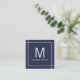 Modern minimalist design features monogram and name with business details in white modern sans serif font style with QR Code on navy blue background.