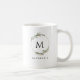 Customizable mug featuring a minimalist watercolor wreath with red floral and green foliage accents. This elegant wreath frames a monogram with the family name and year underneath. Easy to personalize and makes a great gift.