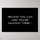 Motivational quote poster featuring "believe you can and you are halfway there" in modern minimalist black and white typewriter typography.