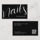features title "Nails" in white modern script font style on front side with business details in white modern sans serif font style on back side, with QR code, on black background.