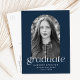 Invite guests to your graduation party with our chic photo graduation party invites. The stylish graduation party invitation postcards feature the graduate's photo framed by a navy arch-shaped frame. "Graduate" is displayed in white modern italicized lettering. Personalize the front of the trendy graduation party invitation by adding the graduate's name, school name, and graduation year. The postcard invite reverses to display your return address and graduation party details.