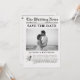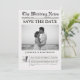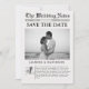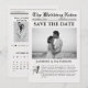 Minimalist calligraphy newspaper wedding save the date with three photos, one of the groom and bride as children and one of them as adults.
