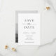 This wedding save the date card features a minimalist and modern style. The front has a clean white background with classic black typography, combining bold serif fonts with a touch of script for a refined look. The back showcases a black-and-white photo of the couple with text overlay, creating a romantic and timeless design.
