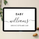 Pregnancy announcement card with modern minimalist design. Features elegant script typography. Personalize all text in this announcement card template.