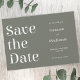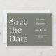 A simple and stylish minimalist save the date invitation announcement with white text on a sage green background. Change the text to customize.