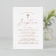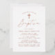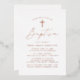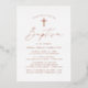 The simple baptism invitations feature a rose gold foil calligraphy script with a white background for a design that is perfect for modern baby baptisms. Personalize the elegant baptism invitations with your child's name and religious event details below. The back of the rose gold foil baptism invitation provides space for additional text and photos.
