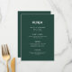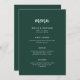 This elegant, minimalist wedding menu card features modern script typography and clean, sans serif text for a simple and stylish emerald green and white design you will love.