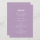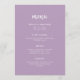 This elegant, minimalist wedding menu card features modern white script typography and clean, sans serif text on a colorful lavender light purple background for a simple and stylish design you will love.