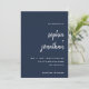 Plain white envelopes are included with paper invitations and will come to fit the invitation size you select. If you don’t need the envelopes, you may choose to not receive them by selecting the dropdown below "Envelopes" and choosing "None." If you’d like to have a design on your envelopes, you can browse all of these available envelopes to find the design that complements your Modern Minimalist Script Navy Blue Wedding Invitation.