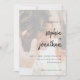Plain white envelopes are included with paper invitations and will come to fit the invitation size you select. If you don’t need the envelopes, you may choose to not receive them by selecting the dropdown below "Envelopes" and choosing "None." If you’d like to have a design on your envelopes, you can browse all of these available envelopes to find the design that complements your Modern Minimalist Script Photo Wedding Invitation.