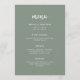 This elegant, minimalist wedding menu card features modern script typography and clean, sans serif text for a simple and stylish sage green and white design you will love.