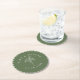 Modern and minimal, this green and white paper coaster features white customizable curved text with a simple center botanical stem and a "stitched" edge