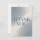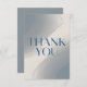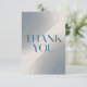 a minimalist design with the words "Thank you" written in a bold, sans-serif font against a neutral background of soft blue and gray tones. The text is arranged in a simple, centered layout, with the "Thank" positioned above the "you" in a slightly offset manner. The background features abstract, flowing curves in shades of blue and gray, creating a sense of movement and depth.