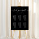 This modern seating chart features sleek black script on a clean white background, designed to accommodate seating for 6 tables. Perfect for couples seeking a minimalist touch at their wedding reception. Matching items available.