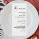 Set a sleek tone for your reception with this minimalist black and white wedding menu. Featuring a clean, modern layout and elegant type, this design suits classic, monochrome, or black-tie weddings. Customize with your meal selections and pair it with coordinating table decor for a polished look. Perfect for formal, modern, or elegant themed celebrations.