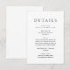 This wedding details card provides essential information for guests, including the time and location of the reception, hotel accommodations with a reserved block of rooms, and a booking deadline. It also includes a wedding website link for more details. The design is minimalist and elegant, emphasizing clarity and ease of reading.