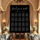 This modern seating chart features white script on a black background, perfect for large weddings. Its minimalist style allows for easy organization of numerous tables at the reception. Matching items available.