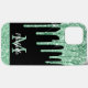 Elegant, modern, girly mint green glitter drips custom personalized name and monogrammed iphone case. This design features light pastel mint green color glitter sparkle drips on black background with custom personalized monogram initial and first name text template. Perfect feminine gift for girl and women who loves pretty trendy glam things. If you need help or matching items, please contact to me.