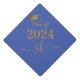 Celebrate the graduate's accomplishment in style with this trendy graduation cap topper. Design features "Class of 2024" in gold font with graduation cap on a classy blue background. Personalize this product by adding year of graduation and the unique stylish one of a kind name initial monogram. Easy to customize. Congratulations!