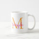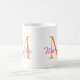 This modern coffee mug features a monogram and name in stylish pink script and orange typography. It is easily customizable.