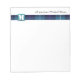 Elegant, modern and trendy customizable notepad features "a note from personalized name" and "personalized monogram" on blue / green leather badge & dark blue / Celadon blue plaid tartan beneath on white background.