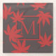 Stylish red and grey monogrammed glass coaster with elegant maple leaf art.