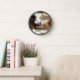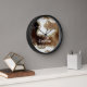 The size of the clock is dramatic and the abstract alcohol ink design is soothing and intricate at the same time. I chose the black frame that adds pop to the blue and gold design. The gold printing would be better in a slightly darker or larger font. I love it and I’m looking for just the right place in ny new apartment. I would recommend this clock for a personal gift or a present. I feel that the quality is excellent for the money! I’m a bit of a clock nut so I’m pretty particular about my purchases. The clock is larger in diameter than many if the clocks I have, so it stands out very well. I think a slightly darker printing color and a moderately larger size would best suit a professional decor or add more impact in a work place item.