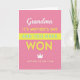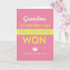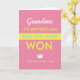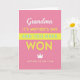 This card features a hot pink background with high-contrast accents in white, bright yellow, and soft blue, creating a lively look that still feels tender ❤️. At the top, a small line of white cursive-style lettering sits like a gentle greeting, setting an intimate tone. Beneath it, large uppercase yellow text announces the occasion, standing out sharply against the pink. A wide bright yellow band runs horizontally through the middle, carrying a key phrase in calm light-blue sans-serif letters that feels like a steady, affectionate promise. Below the band, extra-large chunky yellow letters deliver a triumphant statement, giving the design a confident, celebratory lift. A simple white crown icon nearby adds a sweet “you’re cherished” touch without needing a character or scene 🌼. Near the bottom, a final line in muted golden-yellow text finishes the message with a soft, award-like feel. The layout is centered and stacked in clear lines, with the white crown floating above the lower text on the hot pink field.