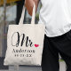 The groom gets his own keepsake with this handsome tote featuring "Mr" in bold calligraphy script accented by a playful pink heart, a personalized last name, and wedding date. A fun monogram accessory for the honeymoon, bachelor party, or everyday life as a newlywed. Last name and date are easy to customize.