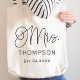 Announce the new "Mrs." with this modern tote featuring oversized calligraphy script paired with a personalized last name and established date in clean contemporary type. A chic monogram keepsake perfect for the honeymoon, wedding day, or as a bridal shower gift. Last name and date are fully customizable.