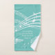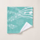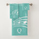 Elegant modern teal Christian Scripture shower curtain, designed with musical notes. There is customizable text that says LET EVERYTHING THAT HAS BREATH PRAISE THE LORD, which is based on Psalm 150 and which you can personalize to suit your requirements. In the bottom right hand corner, there is a customizable MONOGRAM.