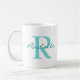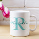 Trendy classic mug featuring a large monogram initial and script name on both sides in teal. Change name & initials using the Template provided. See "About This Product" at side for additional information.