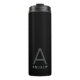 A Modern and Understated Subtly Personalized Name and Initial Letter Stainless Steel Water Bottle with a Custom Monogram in a classic minimal classic sans serif font for a simple and sophisticated timeless masculine look. Shown in gray on a black insulated travel mug, the text colors and fonts can be changed to create your own style.
