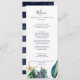 This modern nautical greenery wedding dinner menu card is perfect for a beach or cruise wedding. The botanical design features beautiful green leaves with navy flower and gold starfish accents, giving it a beachy vibe. This menu can be used for a wedding reception, rehearsal dinner, or any event.